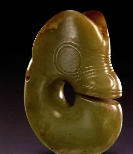 玉质黄绿色,温润。体型肥硕,头部竖立大耳,大圆眼,鼻梁有多道皱纹,嘴部紧闭前凸,与尾相对,头尾间留有缺口,颈部有一对钻孔。整体打磨光润,线条流畅,工艺精美。