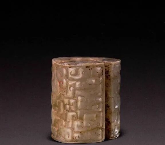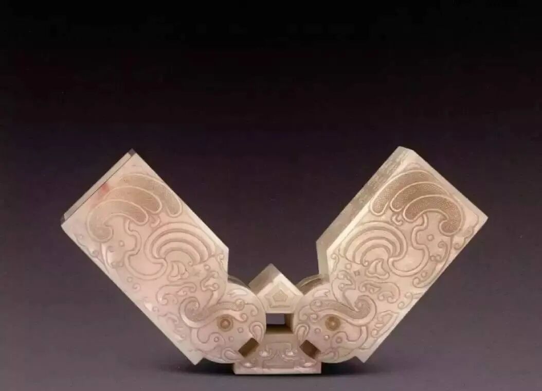 玉质精良。此器由两方筒相连,方筒底部各有一轴,可向左右各展90度,成为长方体,合拢后又恰如工具“矩”形,两面浅浮雕凤纹,合视为兽面。