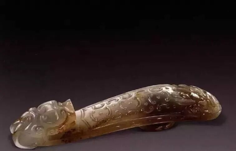玛瑙质,钩首呈回首龙头形状,独角后抿,嘴微张露牙,钩身上部和钩钮的底部浅浮雕勾云纹,尾部浅浮雕一瑞兽。此带钩形体硕大,做工精细。