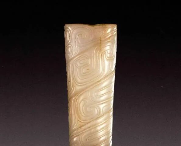 玉质灰白色,有少量土痕和朱砂痕。柱体,一侧有缺口。通体浅浮雕及阴刻云纹、龙首纹,纹饰疏朗,属于春秋早中期装饰特征。