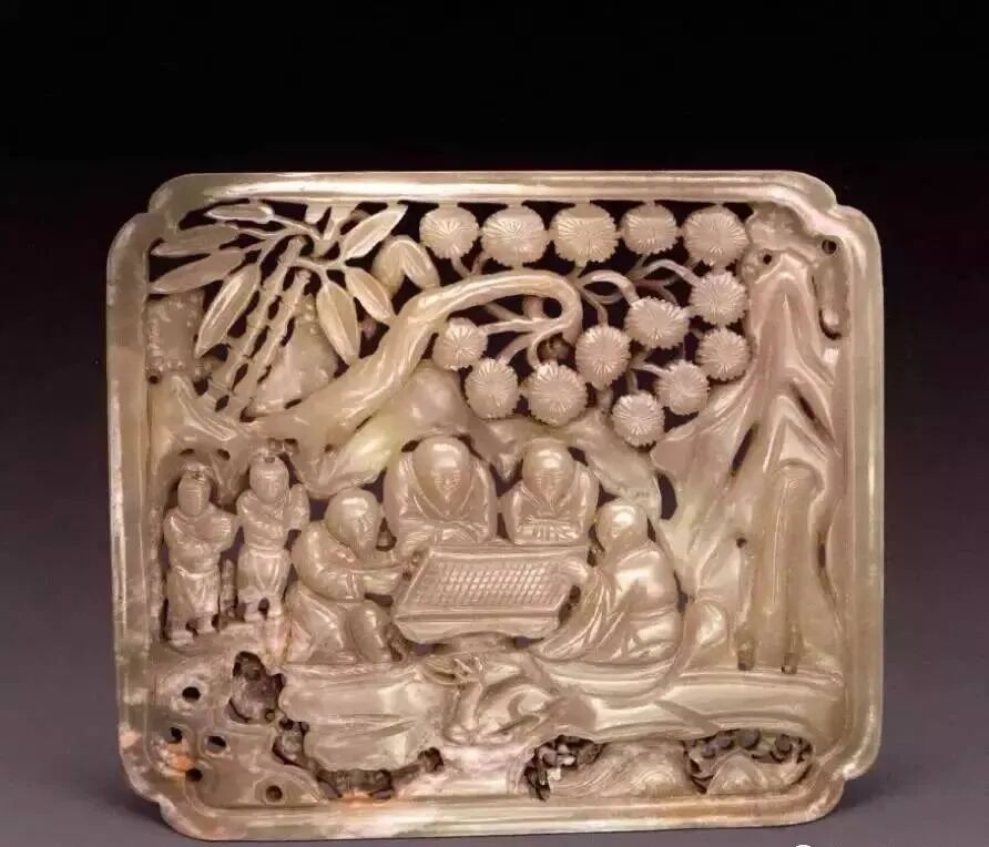 灰青色玉质,长方形,镂雕。松竹阴下,两老坐于石桌旁,欣然对弈,另有两老端坐一侧,观摩助兴,二童子侍立其后。画面恬静幽雅,气氛祥和,富有生活情趣。这种对弈题材在玉雕中较为少见。