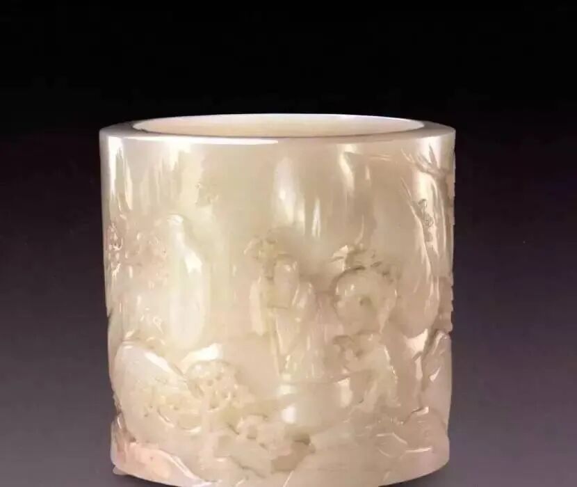 笔筒采用整块白玉料雕琢而成,周身采用浮雕技法,层林深处,细细涓溪流淌,在层层叠叠的崇山峻岭间,雕琢一四角方亭,如一幅秀丽山川自然美景。做工精细,题材新颖,意境深远,代表了清代浮雕技法的高超水平。