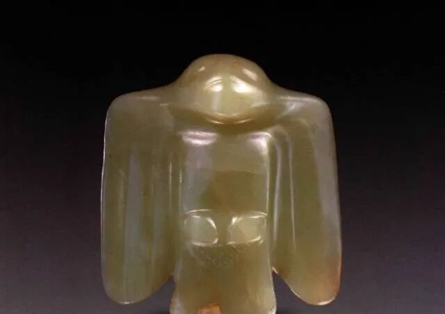 玉质黄绿色,温润。圆雕正视展翅立鸮,头部浑圆,两眼凸出,钩形嘴,耸肩,背面颈部有两对对钻孔,应做佩戴之用。