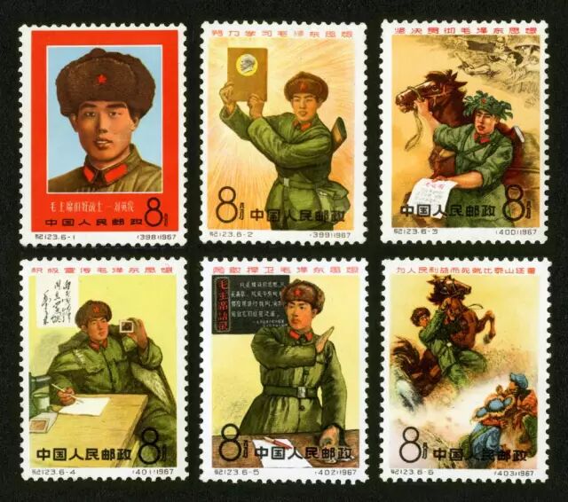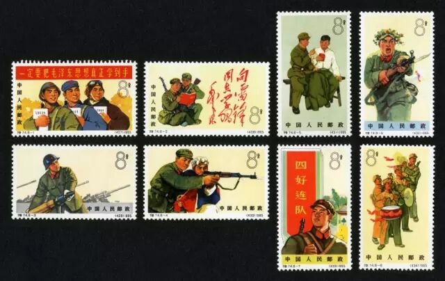 1965年的8月1日,原国家邮电部发行“特74” 《中国人民解放军》邮票一套8枚。该套邮票分别以军人学习、练习、战斗等场景为主要图案,突出了军人的形象,具有浓厚的时代色彩。其中第2枚“五好战士”图案中,首次出现了毛主席题词“向雷锋同志学习”的红色手迹。