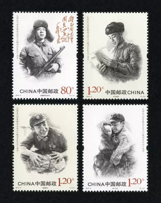 2013年发行的《“向雷锋同志学习”题词发表五十周年》纪念邮票,邮票以雷锋当时的部分照片和事迹为素材,采用素描绘画方式,由李晨设计,四枚邮票分别为:向雷锋同志学习、学习钻研、爱岗敬业、助人为乐,充分体现了雷锋精神的内涵实质即热爱党、热爱祖国、热爱社会主义;钉子精神;敬业爱岗;助人为乐。