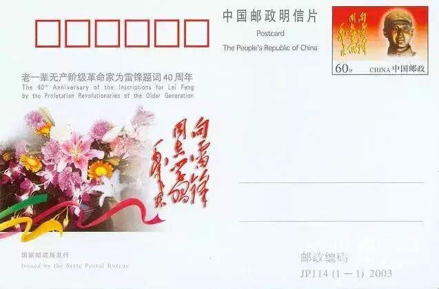2003年3月5日,纪念为雷锋题词40周年,国家邮政局特地发行“JP114”《老一辈无产阶级革命家为雷锋题词40周年》纪念邮资明信片一套1枚,在这枚明信片上,有两处毛主席的“向雷锋同志学习”题词,一处置于邮资图内雷锋像的左侧,一处位于明信片正中,鲜红色重影立体的手迹衬以鲜艳花束,显得格外醒目。