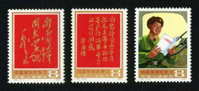 1978年3月5日,我国发行首套纪念雷锋同志的专题邮票—— “J26”《向雷锋同志学习》 。这套邮票一套3枚,由著名邮票设计师孙传哲设计。第1枚“伟大的领袖和导师毛主席的光辉题词” ,图案为毛泽东“向雷锋同志学习”的题词手迹,题词红底金字,镶金色边框,显得分外醒目庄重。第2枚“华国锋的题词” 是时任中央军委主席华国锋的题词手迹:“向雷锋同志学习,把毛主席开创的无产阶级革命事业进行到底。” 第3枚“雨露滋润禾苗壮” ,为雷锋在汽车驾驶室里认真学习《毛泽东选集》时的情景,由设计者根据张峻同志所拍摄的一幅照片绘制而成,表现了雷锋同志认真学习的精神。
