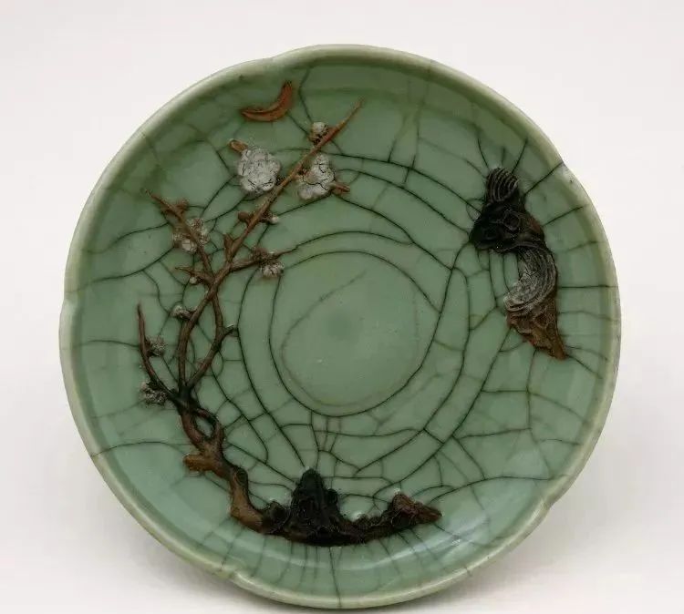 盘心在釉上饰模印而成的贴花岩石梅枝及月亮纹,露胎素烧,纹饰且以白、褐及黑色沥粉着色。此盘可能在烧好后又经火,或者在烧窑中过烧,以致釉面出现大量开片。![]()