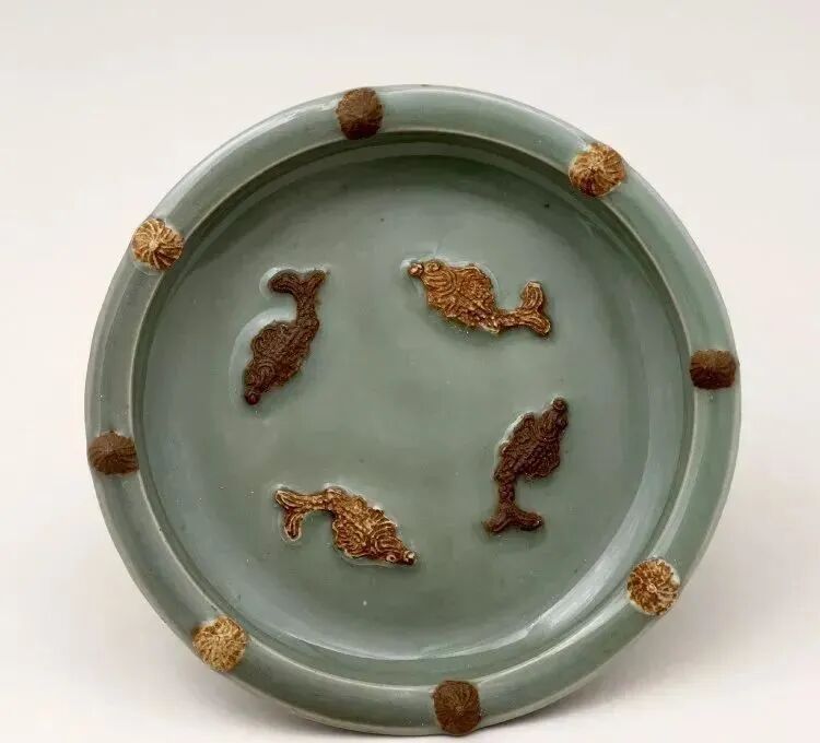 此盘圆唇,折沿,施青釉,盘心饰四个用两种不同颜色的胎土,制作的贴花鱼纹;盘沿处同样以两种颜色的胎土,饰八个贴花贝壳状装饰。![]()