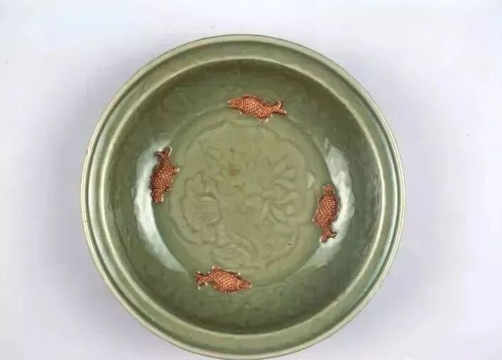 龙泉窑在今天的浙江省,主烧青瓷,北宋时开始流行,与北方的汝窑等名窑,南北呼应,相得益彰。到了元代,风云突变,南方的另一处窑址景德镇,慢慢做大,渐渐一统江山。元代国风开放,四海通达,其瓷艺品味,早已不同于宋朝的简素之风,渐趋丰富华饰。为了求生存,景德镇之外的各处窑场,不得不纷纷改造生产线,寻求差异化品牌战略。具体工艺上,采用雕刻、模印、堆塑,偶有涩胎浮雕黑科技。于是,元朝的龙泉窑,整体美学风格由内向变得热闹起来,生动盎然。![]()