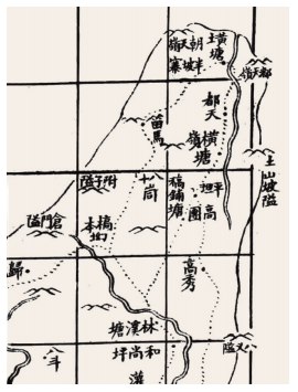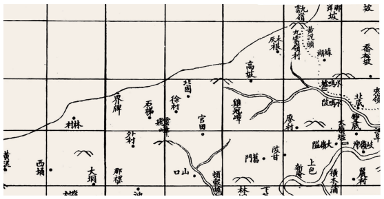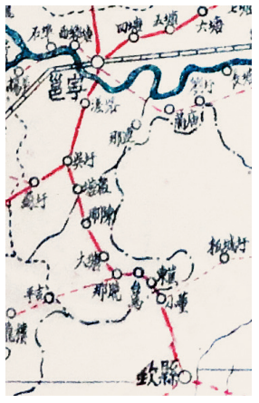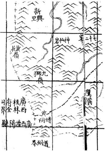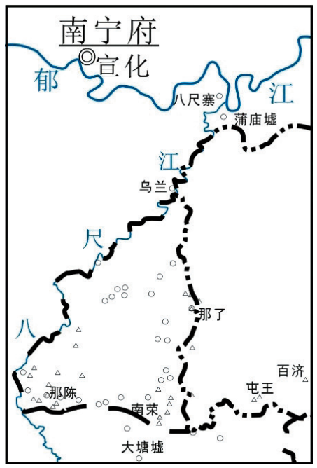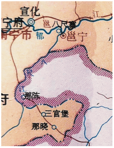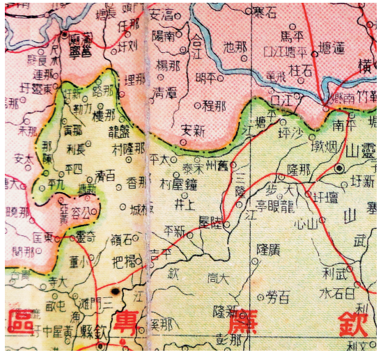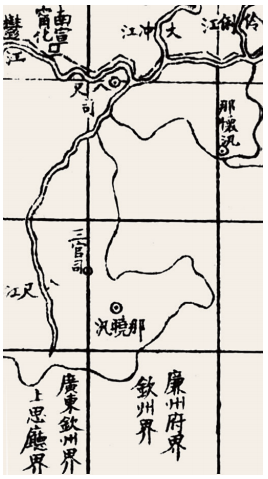 谭图中此段那陈(今广西南宁市良庆区那陈镇)西北以八尺江为广东、广西两省界,以南则过那陈后折向东,过三官堡北。谭图无县界,此段除了是省界及廉州府与南宁府的府界外,也应是广东廉州府钦州(光绪十四年十二月升为直隶州)、灵山县与广西南宁府宣化县界。谭图中那陈属钦州,三官堡与那晓属宣化县(图 1)。