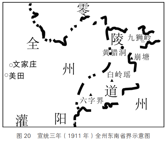 今全州县东山瑶族乡在清末为湖南零陵县、道州(1913 年改为道县)与广西全州(1912 年改全县)交界地。1998 年《全州县志》记 1951 年“湖南省道县所属的白岭乡,零陵县所属的豹子岭、辽冲、黄腊洞、上窗、皎盐岩、早禾冲,以及何家洞乡所辖的灵牌山、耗草坪、长垒、长冲等地划归全县。灌阳县的古木、斜水、雷公岩划归全县,属东山瑶族自治区管辖”,《广西历史地理通考》所记时间与县志不同,其载 1952 年 12 月“湖南省道县第四区的白岭、分水、六字界、坝头、石枧枰、官充坪等地,划归广西全县管辖;湖南零陵县湾夫乡、豹子岭和周家共 233 户瑶族,划归广西全县管辖”,1953 年 5 月“湖南道县析出白岭乡,正式划归广西省全县东山瑶族自治区管辖。湖南省零陵县析出豹子岭、疗冲、黄腊洞、上窗等地区,湾子乡的 3 个分会和皎盐岩、早和冲、下次桥、何家洞乡的第五分会和灵牌山、耗草坪、长垒、长冲、老堂等地区,划归广西省全县东山瑶族自治区管辖”,此段省界的调整确实从 1951 年就开始了,当年零陵县何家洞乡的部分瑶户已经开始划入全县,其余瑶户 1952、1953 年陆续划入。这些新划入的地方构成了今东山瑶族乡的东部。因此,清代广西在全州东山一带省界要比今省界靠西。