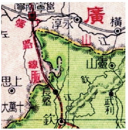 1931 年参谋本部陆地测量总局《那陈墟》图 与武汉亚新地学社 1938 年《广西省明细地图》、1945 年广西省政府统计室《广西省全图》中的此段省界与光绪《广西舆地全图·宣化县图》相同,在今那陈镇以北向东远离八尺江,更靠近今南宁市良庆区与邕宁区区界南段(图 4)。1933 年《中华民国分省地图册·广东省图》中虽此段省界因对南部的插花地归属认识不同而稍显扭曲,但是在北段、中段与八尺江的相对位置与走向和前几幅图相同(图5)。
