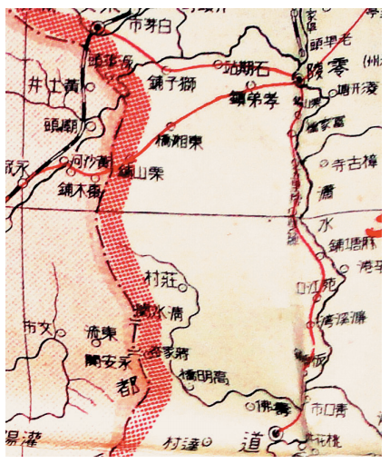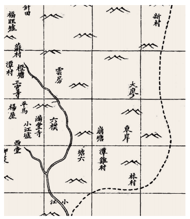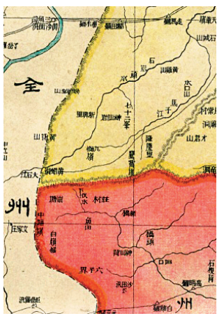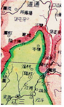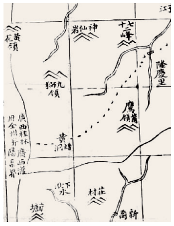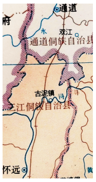 此段指今通道侗族自治县黄土乡、坪坦乡一带湘桂两省的省界。谭图所绘省界与今同,作为聚落的双江(今湖南通道县政府驻地)离其南的湘桂省界尚远。谭图此段省界有误,清代及民国的省界更靠北,紧临双江(图 21)。