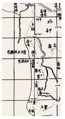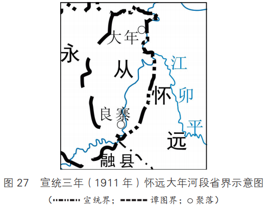 光绪《广西舆地全图·怀远县图》中大年河与福禄江(今柳江)交汇处以南一段(今融水苗族自治县大年乡一带)以大年河为省界,向南(过今平卯河口)则省界在广哨(今融水苗族自治县广校屯)至良霜寨(今融水苗族自治县良双)西,但在平卯河与大年河主支之间,大年河主支自广哨西北才由贵州永从县进入怀远县境(图 26)。清末省界与今广西融水苗族自治县和贵州永从镇界不同,当时省界更靠东。