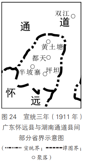 谭图未标出的另一小块犬牙之地为清末怀远县东北伸入绥宁县黄土塘一带,今天这一处的省界更近于自然地理上通道县境向北流的坪坦河与广西三江县境向南流的林溪江两个流域的分界,而在清末,广西怀远县则占有了坪坦河上流。20 世纪 50 年代这一带从三江县划归湖南。