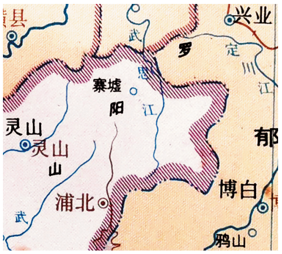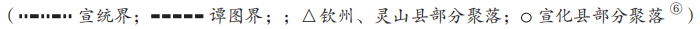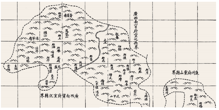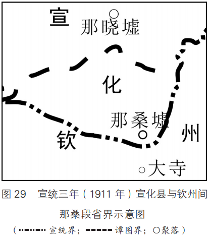 明代当地文献就提及“钦州疆域至广西宣化县界虽两百四十里,然宣化之地与钦州互相交错,自州经西未百里为宣化地者,永乐三乡之地广西宣化大较得三之一要,二百四十里非尽钦州地也”,这一带明清尤其是清末省界的复杂性表现除插花地之外,犬牙之势也很明显,清代那陈一带往东有一块灵山县向北深入南宁府宣化县、永淳县间的一块(今南宁市邕宁区百济、那楼、新江三镇一带),其东南则宣化县亦有伸入灵山县的地块(今钦州市钦北区新棠镇以西),南部则有宣化县伸入钦州的那桑一片,于是就造成了在地图上确定这一带省界之不易。灵山县向北犬牙入南宁府的这块幅员比较大,谭图基本绘出,后两块由于地域较小,在谭图上表现不明确。虽然民国时期广西、广东两省都想调整,却终未能实现,20 世纪 50 年代这一带政区疆界变化复杂,更增加了人们在追溯清代省界时的困难。