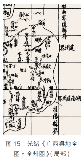 桂林府全州在明清时期本身即是湖南与广西之间的犬牙之地,在谭图上,全州东南部向东突出的一小块引人注目,即今桂林市全州县东山瑶族乡、都庞岭北段。谭图中这一块清代嘉庆年间的省界与今省界一致,但经前文考证,其东部是 20 世纪 50 年代从湖南零陵、道县划入的,因此清代其向东并不如今天如此之突出。这一带山区界于两省、三个县级政区之间,交通不便,清代人口主要是瑶族,地方行政管理的触角尚未深入,因此湖南、广西两省的清末地图都未标出。