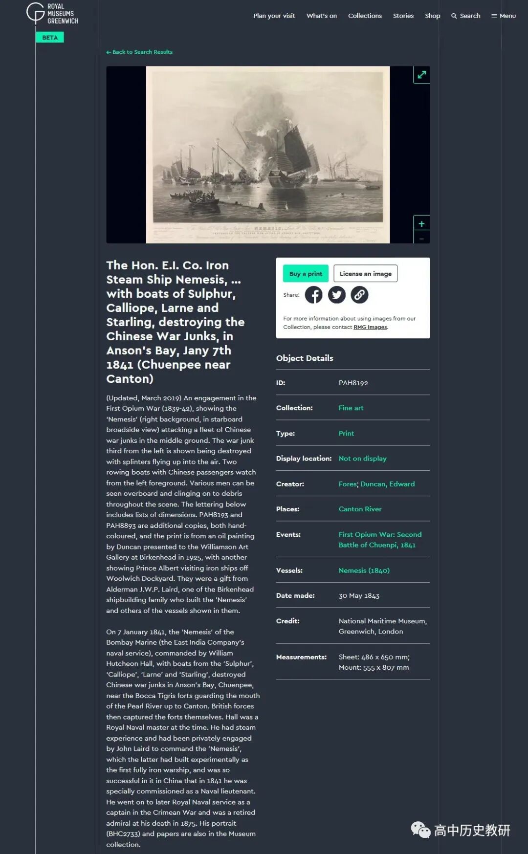 图6https://www.rmg.co.uk/collections/objects/rmgc-object-148840顺便提一下,《复仇女神号:铁甲舰与亚洲近代史的开端》这本书中也引用了图1([英]安德里安G马歇尔著 彭金玲译《复仇女神号:铁甲舰与亚洲近代史的开端》,广西,广西师范大学出版社,2020 年 8 月,插图第 4 页。)图中解读说此画原作者是内尔(如7),但从伦敦格林威治国家海事博物馆官网(图6)以及原图下方标注都表明此画都是由爱德华邓肯所绘制。