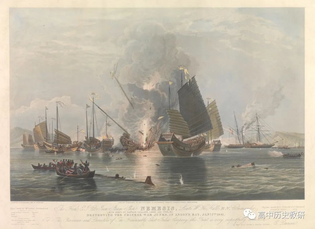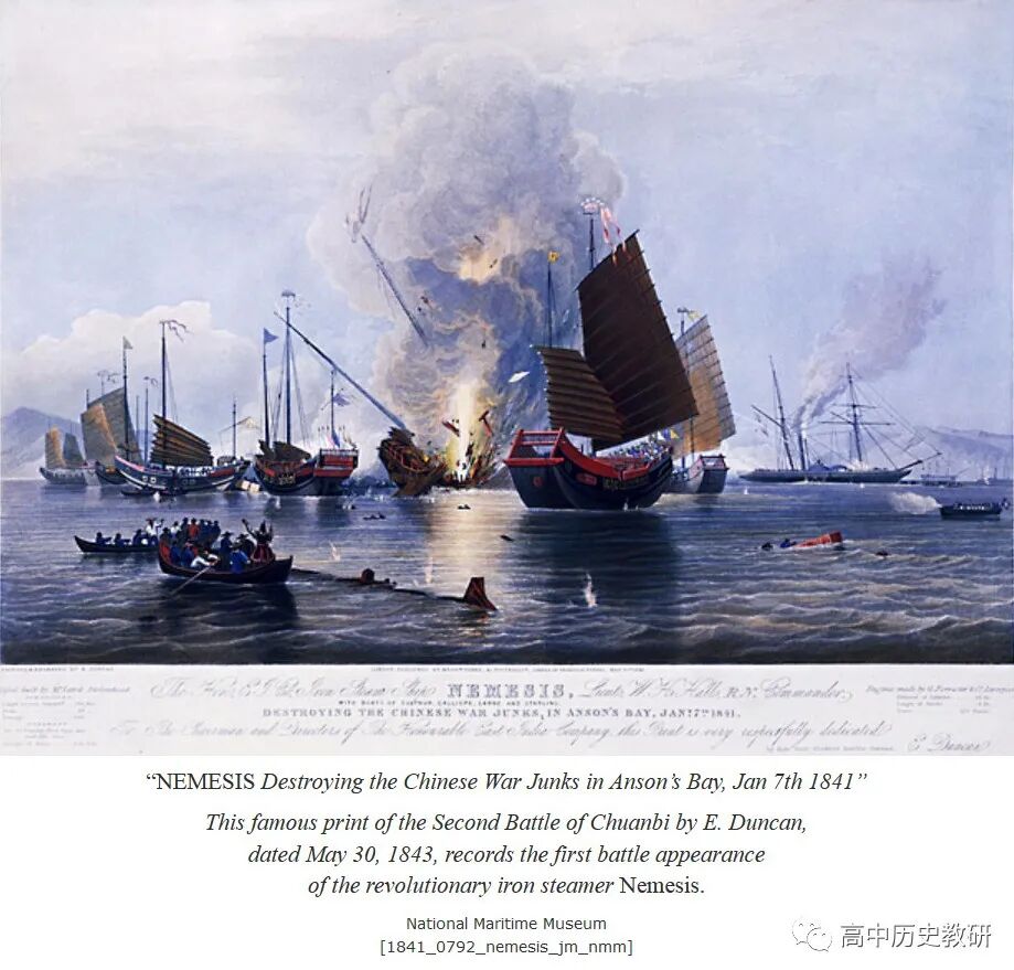 但根据伦敦格林威治国家海事博物馆官网显示,图1则是英国海事画家爱德华邓肯完成于 1843 年 5 月 30 日的油画,而并非人民教育出版社出版的《中外史纲要(上)教学教师用书》所述“原图选自Basil Lubbock 的 the opium clippers”。从画面内容看,它与图5极为相似;从时间上看,成画时间晚于画面反馈的战争时间(1841年1月7日),尚无法证明它是战争现场素描的彩色复原图,即无法证明其高度真实性。