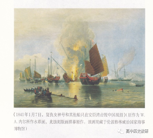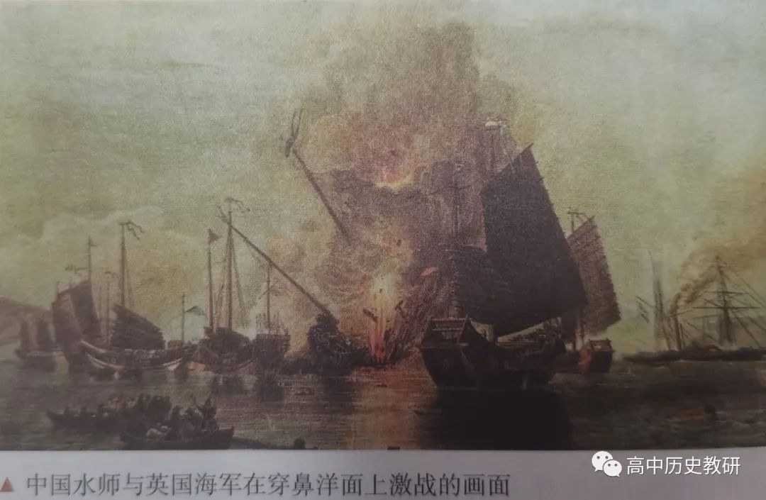 第四,这幅画为何把中国船只放在 C 位,英军军舰在又远又靠后的右边?第五,教材用的是“画面”二字,这是一幅画还是战场真实场面的复原?