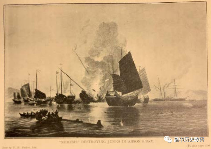 图4Basil Lubbock,The Opium Clippers,(Boston Charles E.Lauriat Company,1933),pp.200.书影中明显有一行英文:“NEMESIS”DESTROYING JUNKS IN ANSON’S BAY。显然,这段文字比教师用书上的表达更能有利于对此图进行深入的探讨和史料价值的挖掘。而这对于很多乡村中学或者是网络并不发达的地区来说,教师用书上的解读显然不如这样一句话,显得苍白无力。但这段文字和出版信息证明了这本书也只是引用了这幅画作来表达书作者自身的观点,并不能证明这幅画作反映的内容一定就是即时的和拥有相对真实性的现场情景。事实上,19 世纪,艺术家上前线像战地摄影家一样逐渐成为一种常规。他们或者着重表现一种使得人们可以把它当作图像来解读的场面,或者很擅长用“冷”画像取代或补充“热”画像。后者指带有观察者的情感,而前者以提供信息为目的。([英]彼得伯克(Peter Burke)著 杨豫译《图像证史(第二版)》,北京,北京大学出版社,2020 年 7月,第 227 页和第 229 页。)