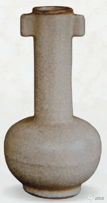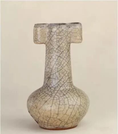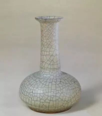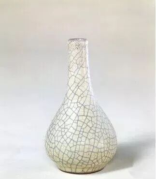 瓶小口,长颈,颈下渐阔,最长径在近足部,圈足上宽下窄。通体施米色釉,开黑色、米色纹片,俗称金丝铁线,呈自右上向左的斜纹。此瓶造型秀美,器型为宋代所仅见,釉色润泽,纹片典型。此类器传世极少,弥足珍贵。