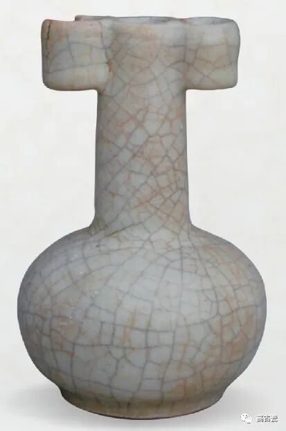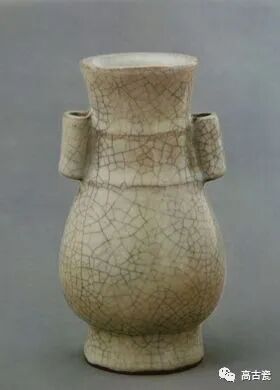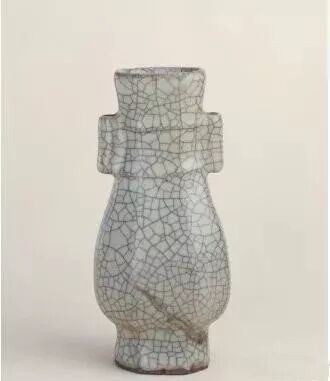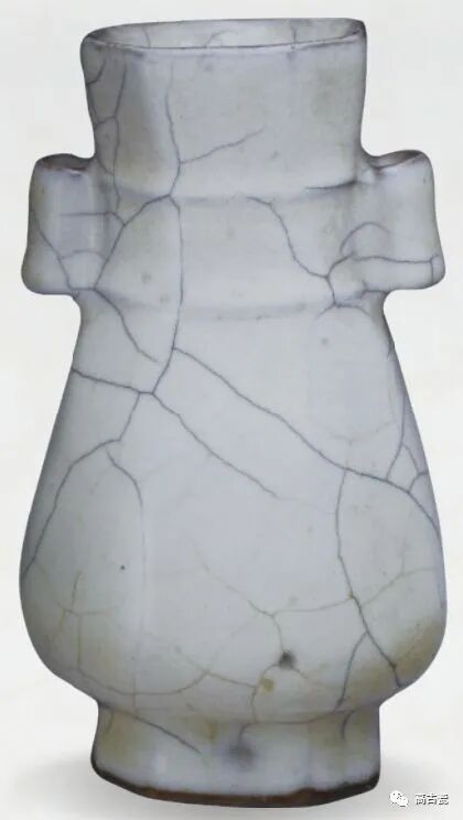 瓶仿青铜器式样,为八方形,口微外撇,颈部凸起两道弦纹,两侧各有一筒状圆形直耳,中空,俗称“贯耳”。腹下部丰满,高圈足微外撇。底足一周无釉,呈黑色。此瓶釉面光亮莹润,通体开细碎鱼子纹,纹片自然美观,别具一格,为典型的哥窑产品。