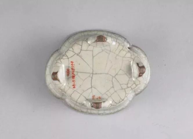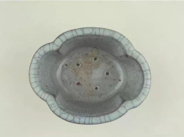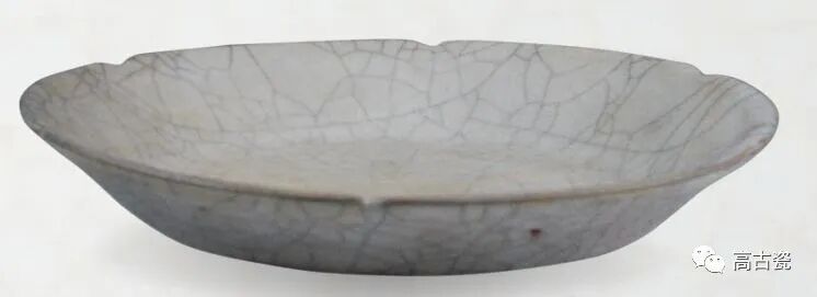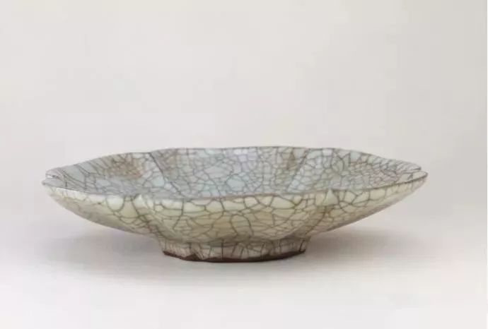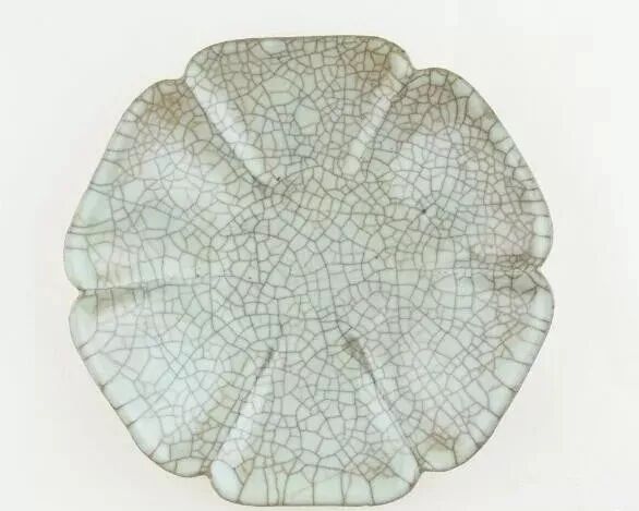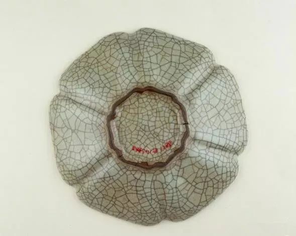 盘呈六瓣葵花式,浅腹,坦底。腹壁向里凸出6道棱线,圈足亦随腹壁起伏变化。通体施青灰色釉,釉面开细碎片纹。圈足露胎处呈黑褐色。此盘造型优雅、大方,线条富于变化,为哥窑的代表作品。宋代官窑、哥窑和龙泉窑的器物,往往在足部无釉处为黑褐色,即所谓“铁足”。成因是此类器物胎骨含铁量特高,在还原作用较强的足部露胎部分就呈现此色。