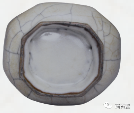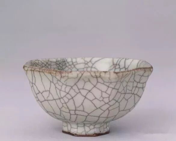 碗呈八方形,口微外撇,弧壁,瘦底,八方形圈足,足微外撇。碗里外满施釉,外壁施釉较厚,开片较大,为冰裂纹;内壁施釉薄,开片细小而密集,形成一种无规则的蜘蛛网线,即百圾碎。口沿因釉下垂呈现出紫色,足边无釉,呈铁黑色,俗称“紫口铁足”。此碗造型新颖雅致,折角棱线分明,线条宛转自然,为宋哥窑器物中的珍品。