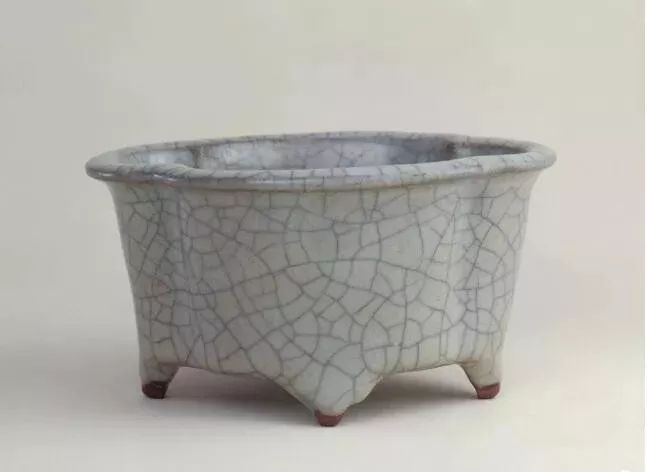 花盆呈四瓣海棠花式,直口微撇,出沿,斜壁,平底,下承四如意云头形足。里心有5个支钉烧痕。里外施灰青色釉,足底边无釉,呈黑色。釉面开片,外壁釉面开片较大,为冰裂纹,盆内釉面则开细碎片纹,称鱼子纹。片纹纵横交织,有较强的艺术魅力。宋代花盆以钧窑产品传世较多,哥窑瓷器以盘、碗、瓶、洗等多见,花盆则较为少见。