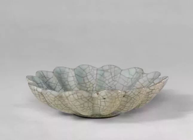 哥窑青釉菊瓣式盘,宋,高4.1cm,口径16cm,足径5.6cm。清宫旧藏。