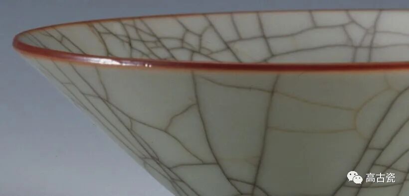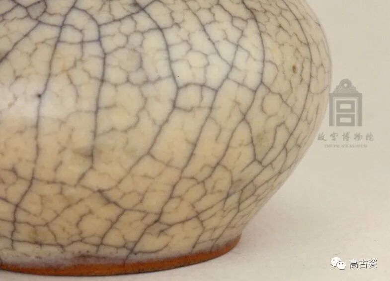 釉面布满细碎的开片纹,深浅不一,如网如织,深纹片呈黑色,浅纹片呈黄色,俗称“金丝铁线”纹。