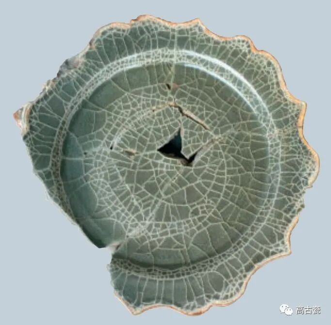 ▲龙泉窑黑胎青釉菱口折沿盘,浙江龙泉窑瓦窑路窑址出土