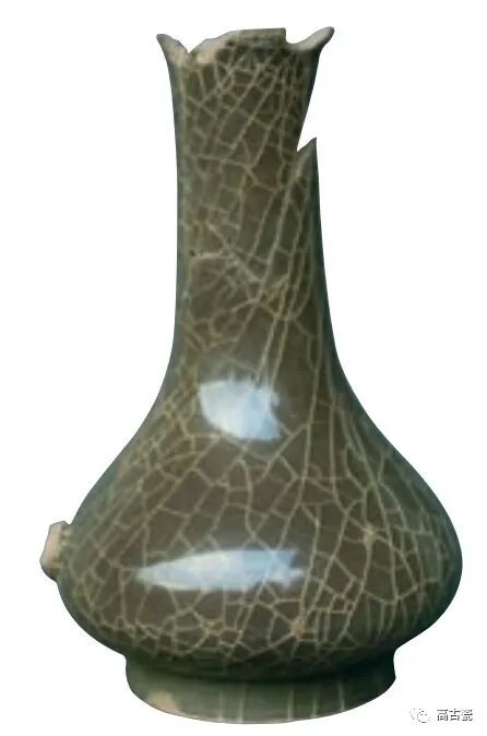 ▲龙泉窑黑胎青釉长颈瓶,浙江龙泉窑瓦窑路窑址出土