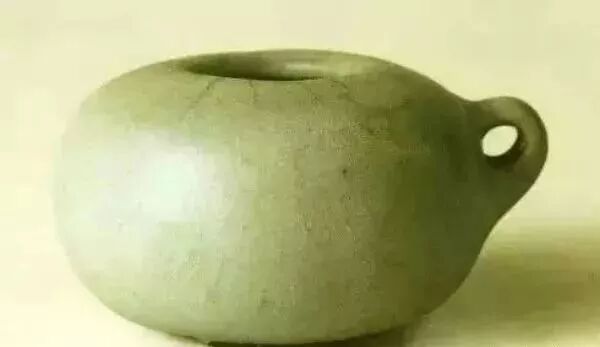 敛口,圆肩,浅腹,园底,器身扁圆,肩旁有一小圆系。胎白色,施粉青色釉,釉厚,光滑润泽,有玉一般的质感。有冰裂纹,裂线呈黑色。底部有三个支钉痕,涂有紫黑色,该器很小,应是鸟笼用品。