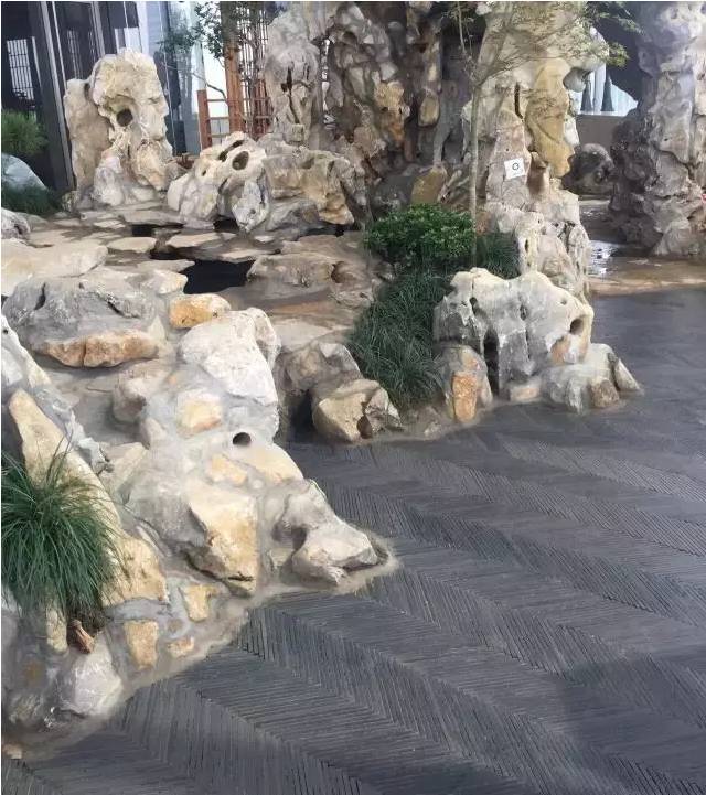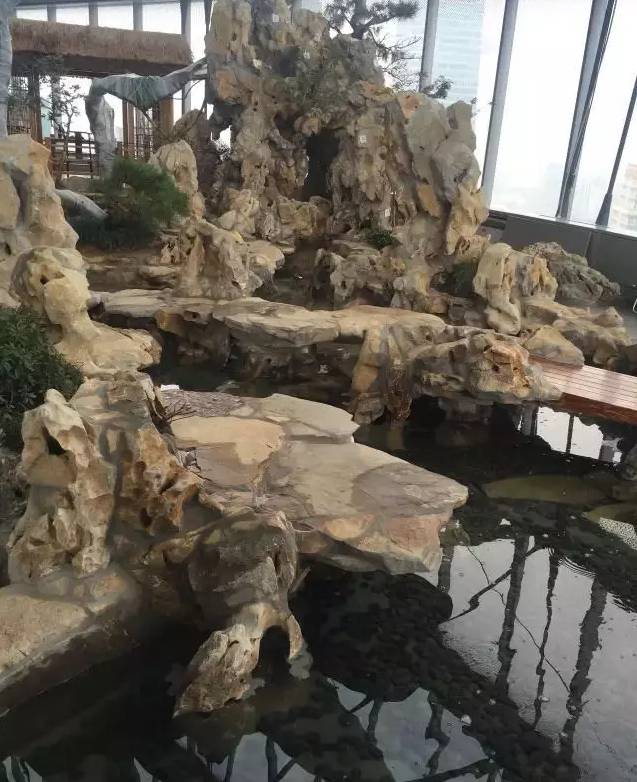 太湖石的特点是“皱、漏、瘦、透”。石头中间的水里养着金鱼。