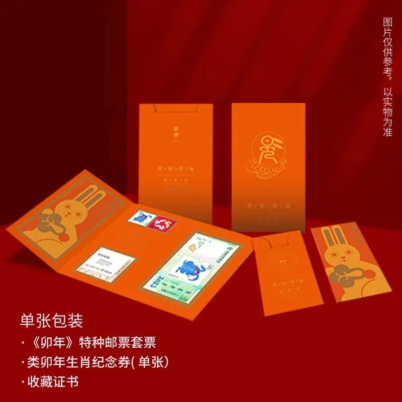单券价格低,里面有一张纪念券和一套兔年邮票,适合入门级收藏,采用红包式的包装。预算不够的,买单券就够了。