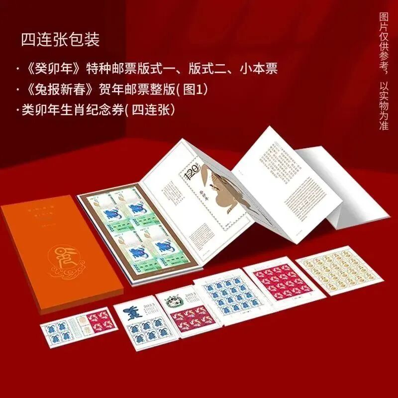 四连体发行量最少,附赠兔年邮票大版、小版、小本票,以及《兔报新春》贺年邮票大版,收藏价值更高,也更适合送礼。