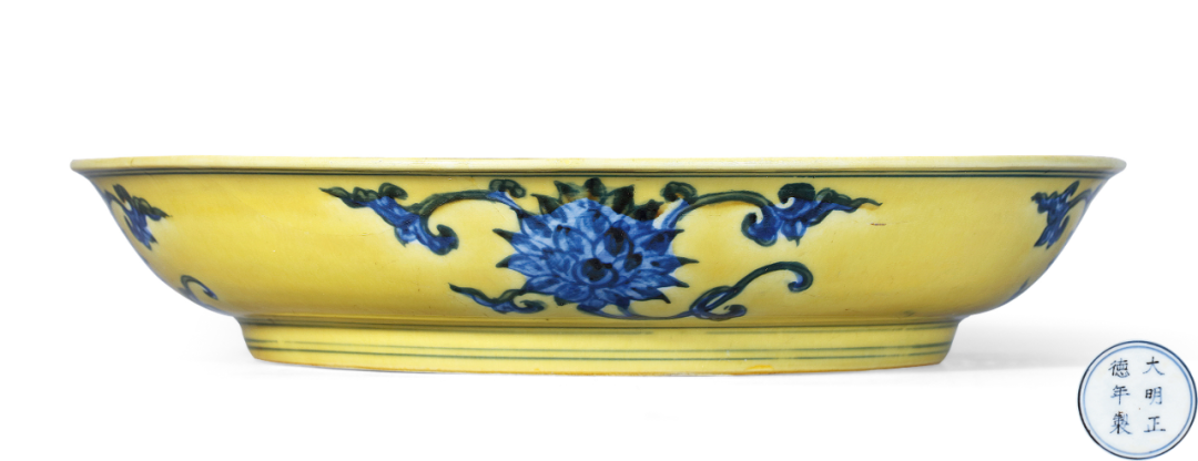 遍查海内外重要公私收藏及艺术市场,与本品相近者仅见发表两例,一例藏上海博物馆,外口沿书“大明宣德年制”单行楷书款识,另两例原藏伊朗阿德比尔清真寺、现藏于伊朗国家博物馆(据 JohnAlexander Pope 于他的著作 Chinese Porcelains From the ArdebilShrine 中记载,阿德比尔清真寺中曾发现两例,此外另有一例尺寸稍小者藏于伊斯法罕,但未见发表),本品为唯一可于市场流通者,至为珍罕。