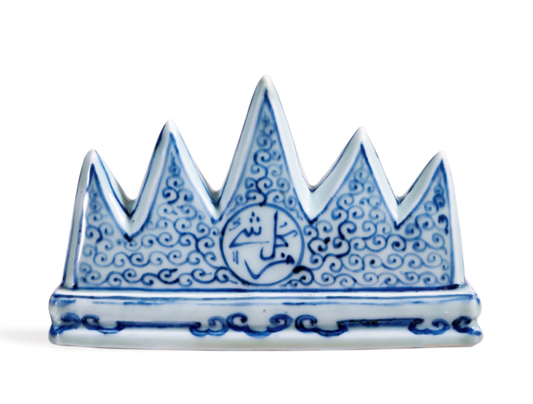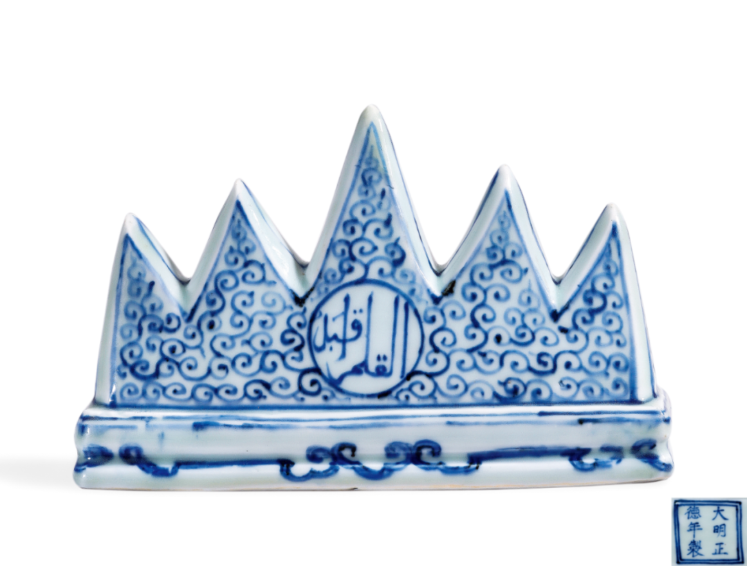 笔架呈山字形,五峰式,中间一峰稍突,左右两峰依次低落。通体以青花绘饰,青花发色深沉。器身绘卷草纹,流动写意。于整器正反两面,正中圆形开光内书写阿文,意为“笔是优于一切”。底部外满施白色透明釉,釉色光亮、肥厚,正中落双方框内,青花“大明正德年制”款。