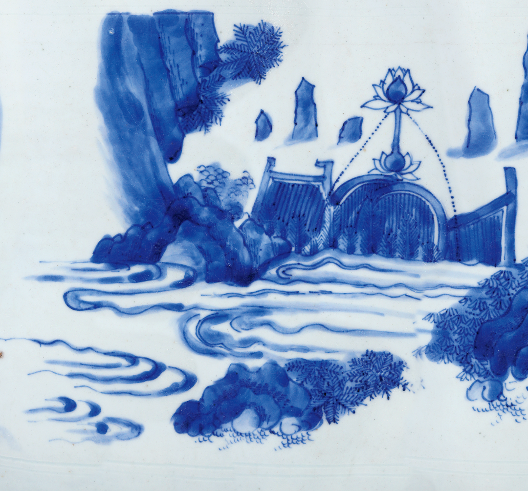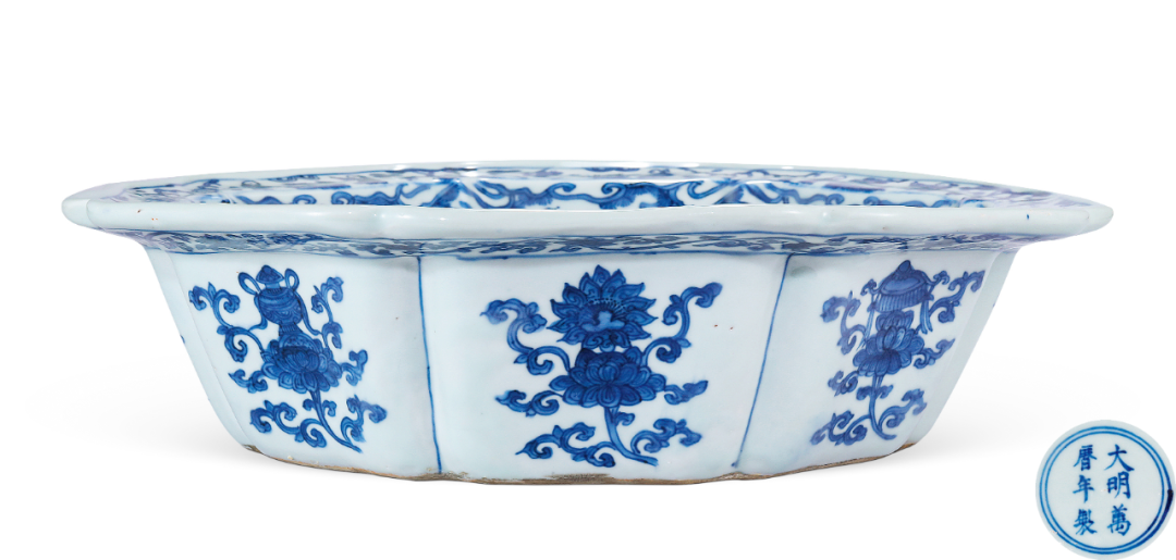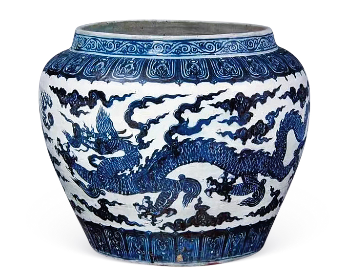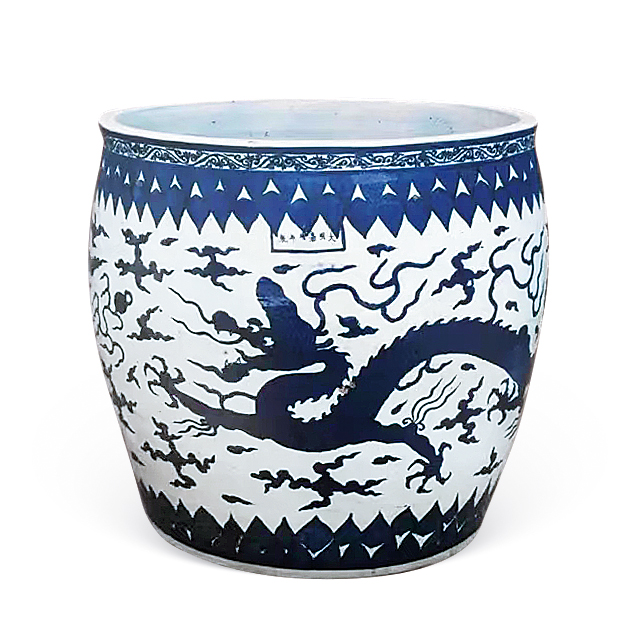 明嘉靖一朝制瓷工艺中一项难得的成就,就是成功掌握烧制大龙缸的技术。此件嘉靖青花大缸硕大周正,风格敦厚古朴,是以耗时靡费、制作极为复杂而着称的大龙缸中难得的经典作品。