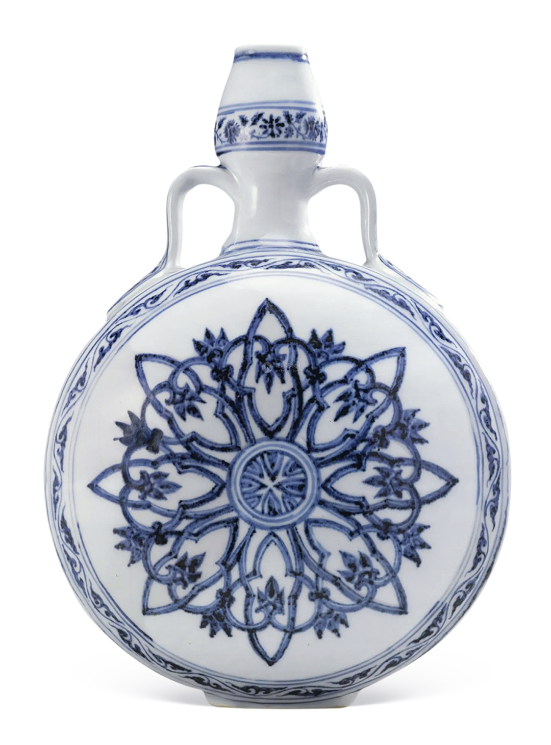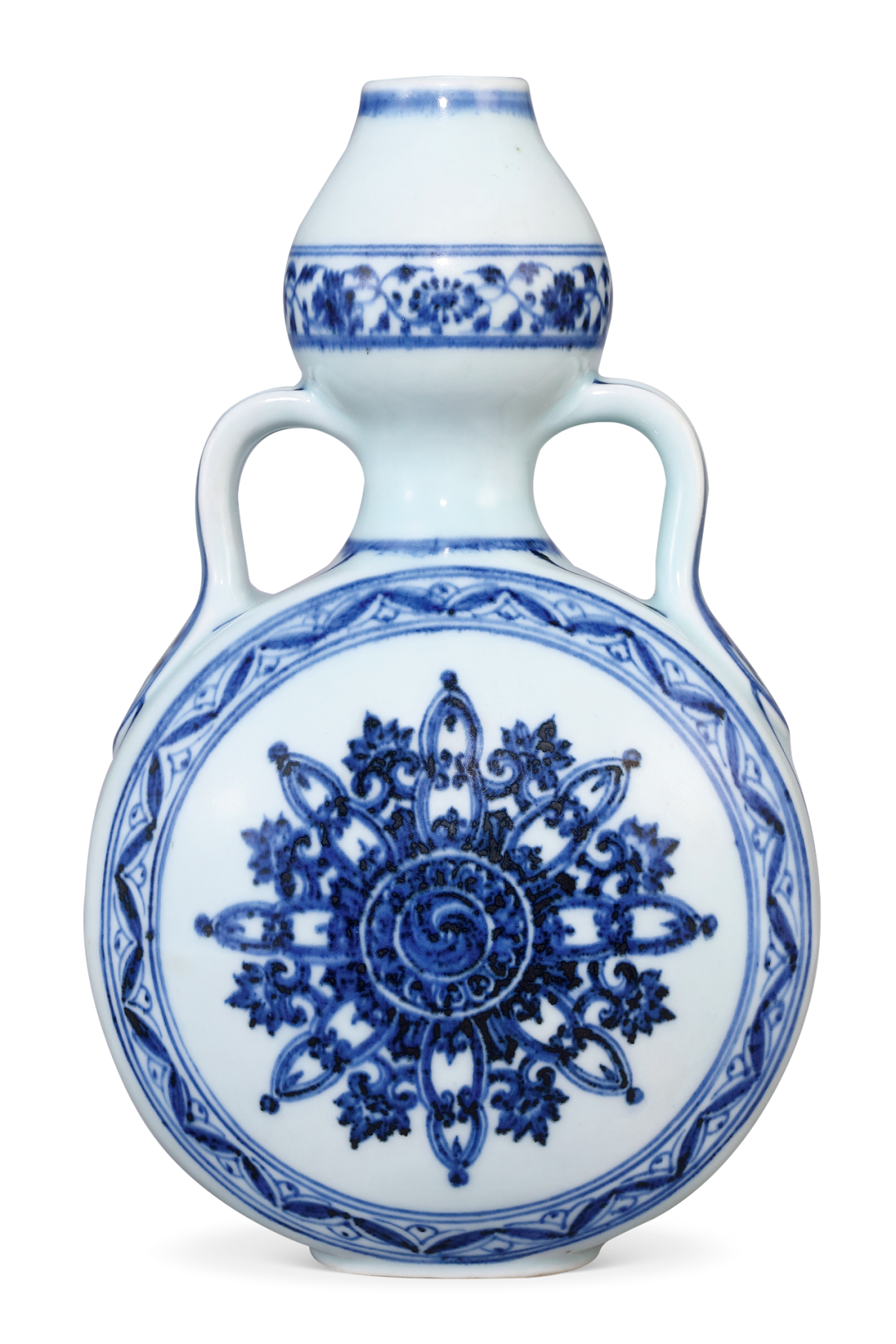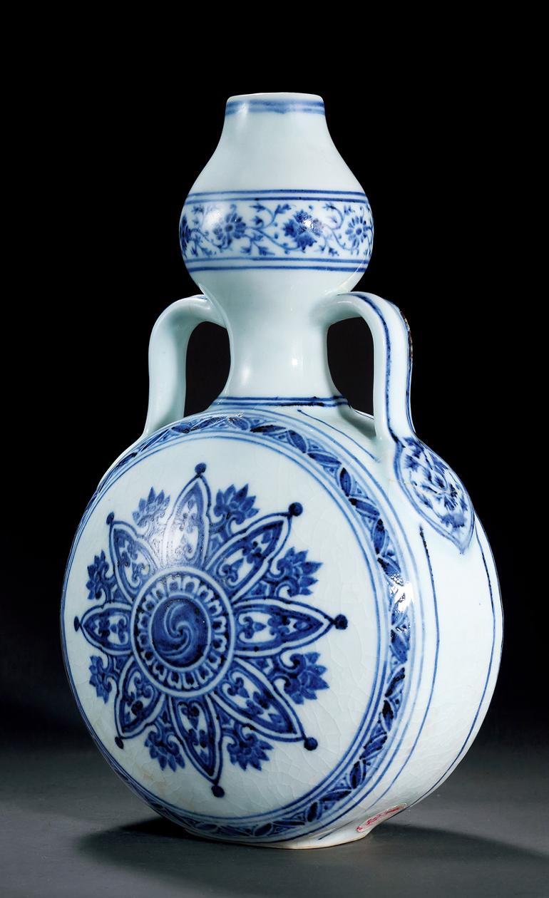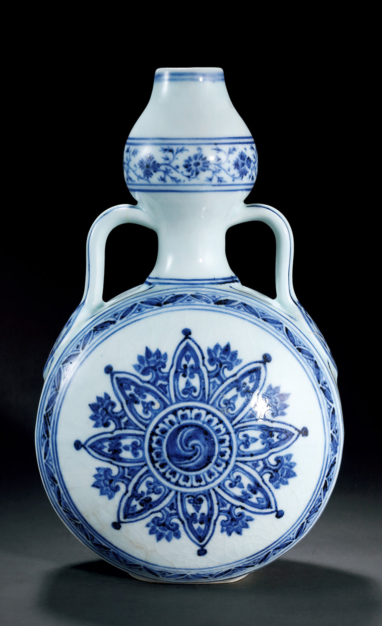 瓶呈葫芦形,分上、下两部分,上部似蒜头形,颈至肩部两侧各饰一对绶带耳,下部为扁圆形,腹部略鼓,似椭圆形方圈足,形制仿照西亚阿拉伯铜器烧造而成。釉质肥厚晶亮,口沿下绘一周缠枝花卉纹,腹部两面各绘宝相花纹,边际环以卷草纹,耳上绘折枝花卉。整体以青花所绘纹饰带有浓郁的西亚色彩,色泽青翠明快,所用进口青料——苏麻离青,在青花纹饰中呈现钴铁的结晶斑,浓重处凝聚成黑青色,有下凹深入胎骨之感。
