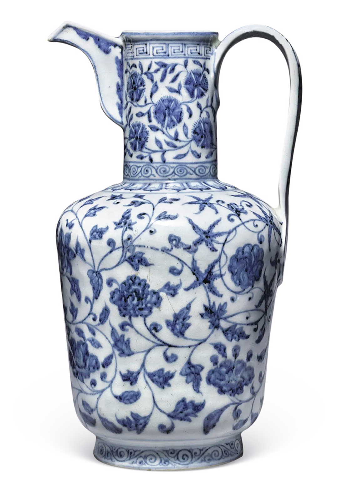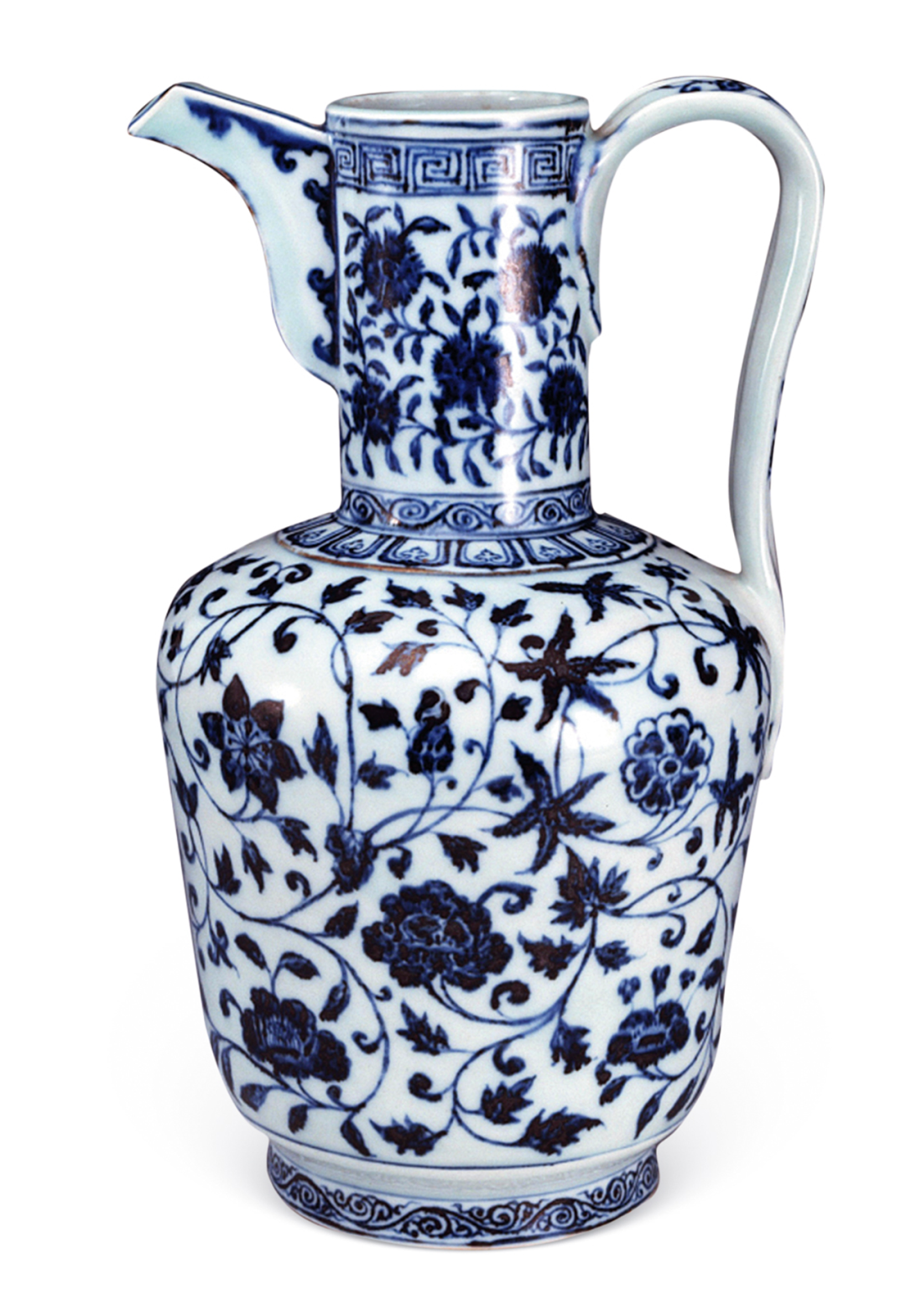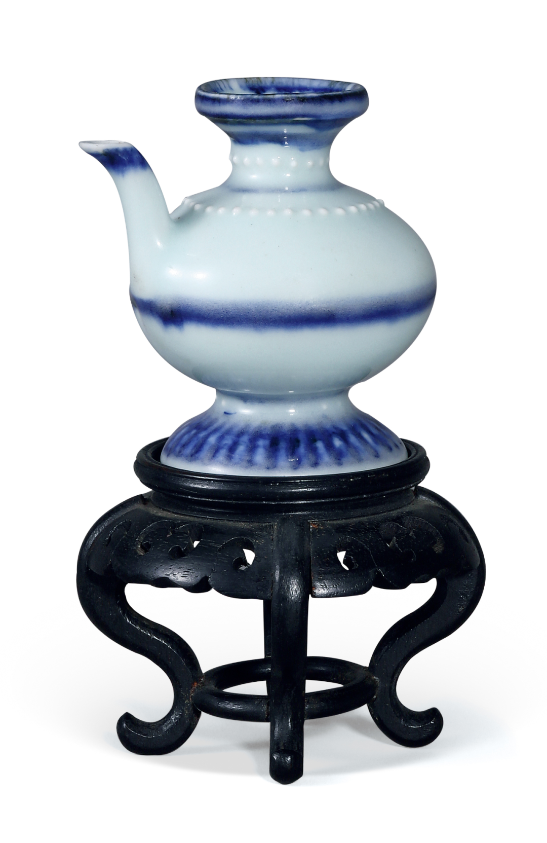 本品盘口,束颈束腰,颈部分别饰以两圈鼓钉纹,圆腹,流呈弯弧型,器座饰有瓜棱纹,圈足内凹。整器分别于口沿、流口、腹部、近足处填涂一周青花,晕散处可见苏料蚀骨堆叠之感,颇具明代早期之典范。明初,明朝政府对西藏采取“多封众建”、“尚用僧众”的治藏方略,既赐封三大法王(代表西藏三大宗教派别),也赐封五王(管辖地区的行政首领)。宣德皇帝曾大批分封西藏僧人为法王、国师;进京驻锡的藏僧也越来越多,至“宣宗末年,入居京师各寺者最盛”。通过封授数量的“多”,分散各方势力,削弱各自的力量。这一政策的施行,对明朝西藏地区的长期安定,起到了重要作用。