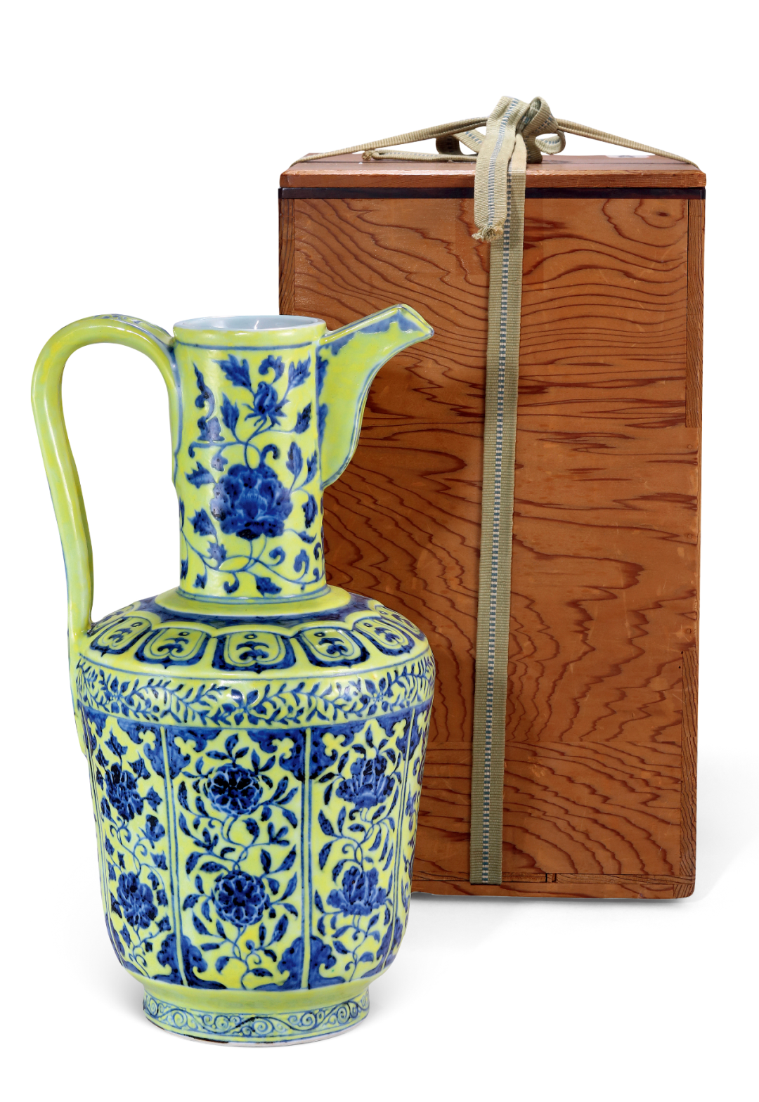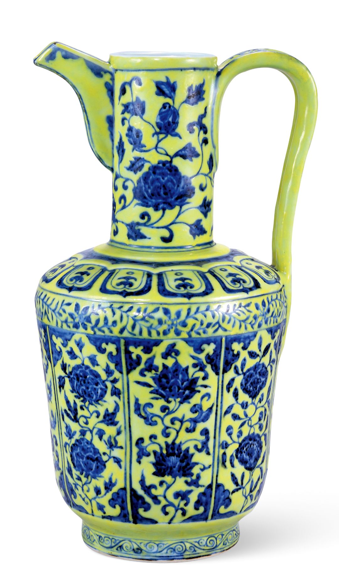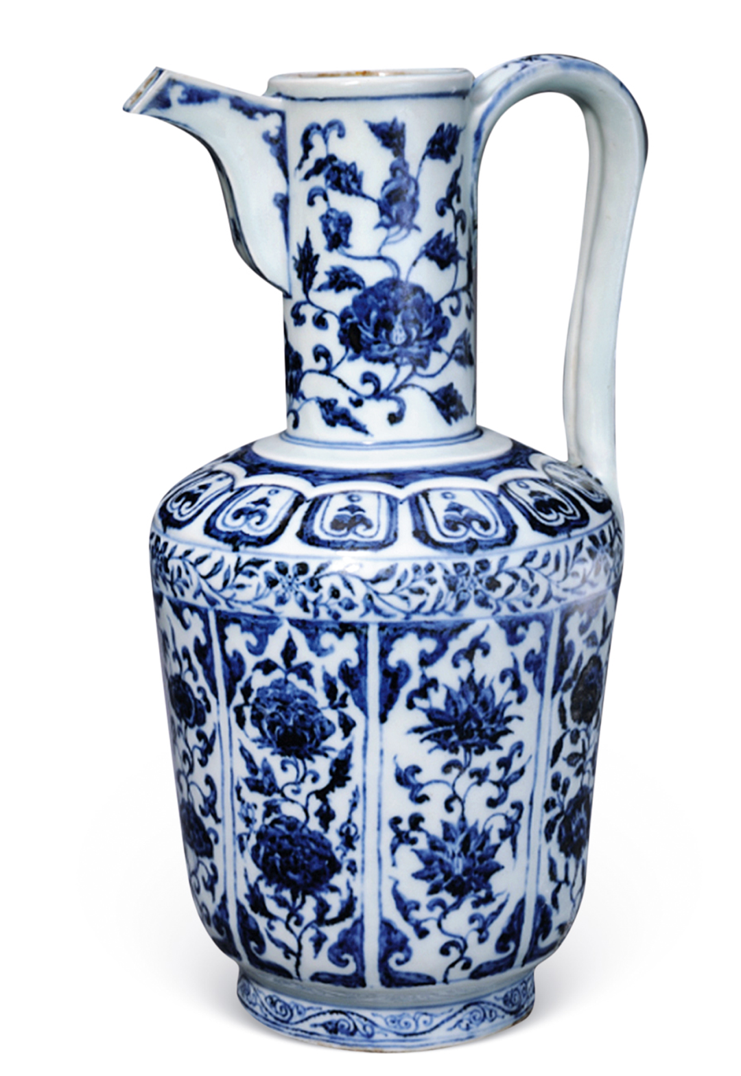 本品盘口,束颈束腰,颈部分别饰以两圈鼓钉纹,圆腹,流呈弯弧型,器座饰有瓜棱纹,圈足内凹。整器分别于口沿、流口、腹部、近足处填涂一周青花,晕散处可见苏料蚀骨堆叠之感,颇具明代早期之典范。明初,明朝政府对西藏采取“多封众建”、“尚用僧众”的治藏方略,既赐封三大法王(代表西藏三大宗教派别),也赐封五王(管辖地区的行政首领)。宣德皇帝曾大批分封西藏僧人为法王、国师;进京驻锡的藏僧也越来越多,至“宣宗末年,入居京师各寺者最盛”。通过封授数量的“多”,分散各方势力,削弱各自的力量。这一政策的施行,对明朝西藏地区的长期安定,起到了重要作用。