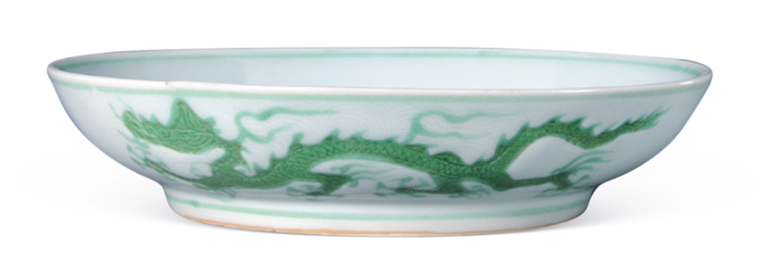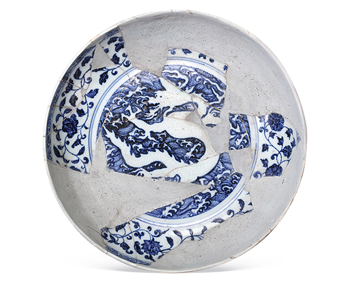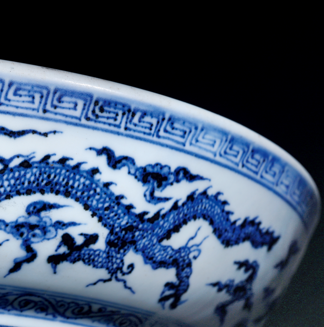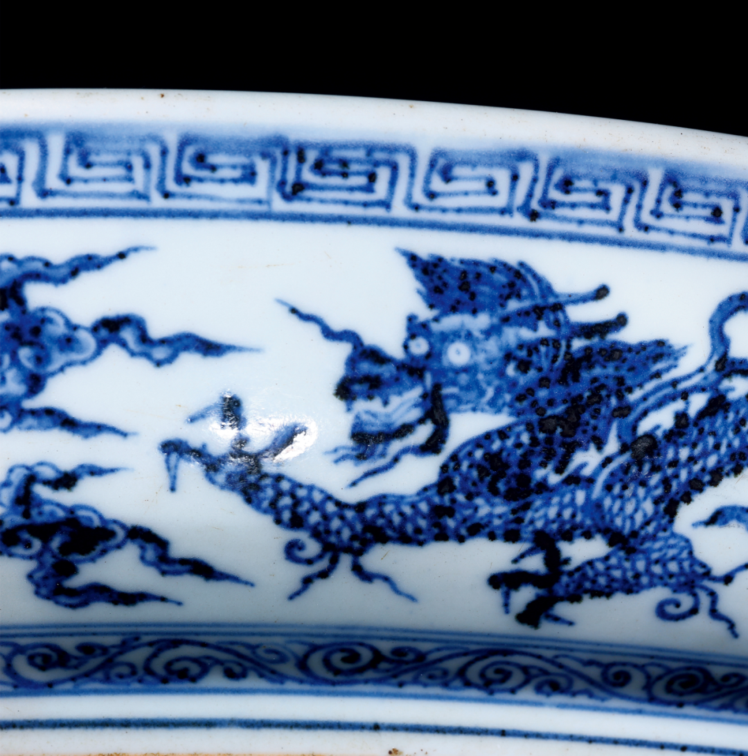 本件永乐青花白龙盘,除伊朗国家博物馆藏两例,上海博物馆藏一例宣德年款者外,完整器仅此一例。1993年景德镇御窑珠山出土尺寸较小一例(直径28厘米),青花发色较为晦暗,未拣选供御,即行销毁。可见其烧制之难,存世之罕。