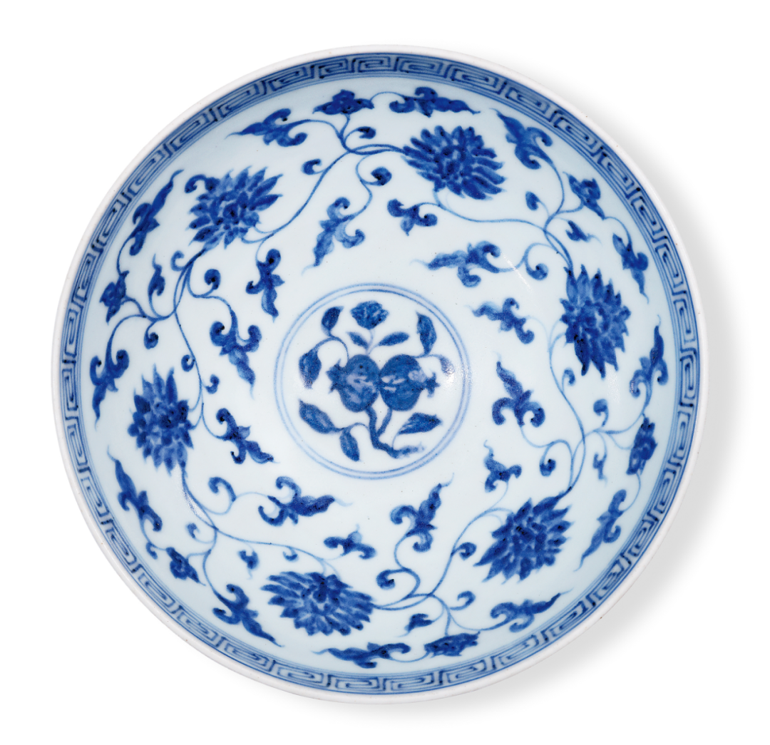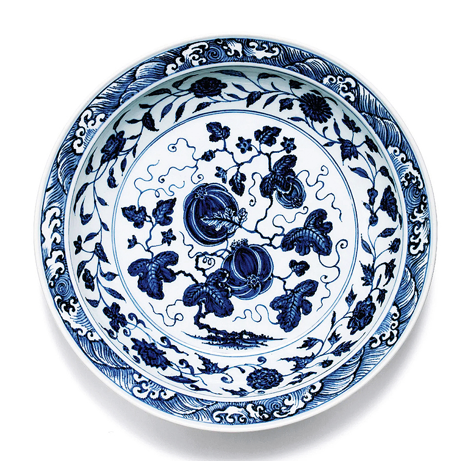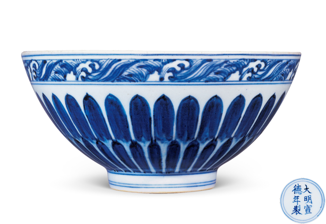 本品圆直口,深弧壁,小圈足,碗心内凹,呈尖底状,俗称鸡心碗,一般因其碗形颇似莲房,又称“莲子碗”。此类莲子碗之尺寸有大、中、小三种,本品为其大者。造型端庄丰盈,胎骨坚致,釉质厚润,微微泛起橘皮纹,时代特征鲜明,外壁口沿绘海水波浪纹一周,白浪翻涌,气势十足,腹壁装饰双层仰莲瓣纹,莲瓣疏朗交替,颇见韵律之美,内壁口沿饰一周回纹,下承六组缠枝西番莲纹,枝蔓缠绵,柔美舒畅,各见风姿。碗内心饰折枝石榴纹,果实累累,丰满诱人。圈足修整规矩细致,一丝不苟,彰显严谨的匠作精神,底心青花“大明宣德年制”六字双行楷款,如出明初重臣沈度之手。