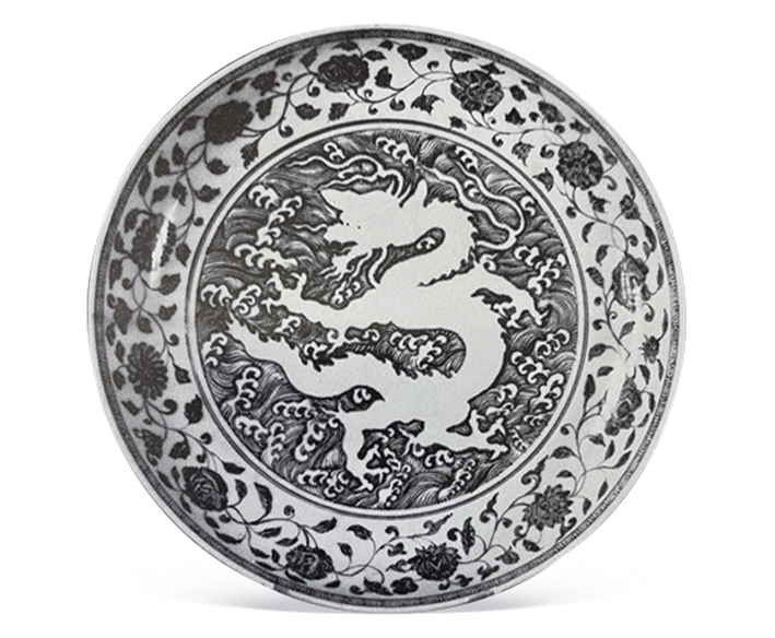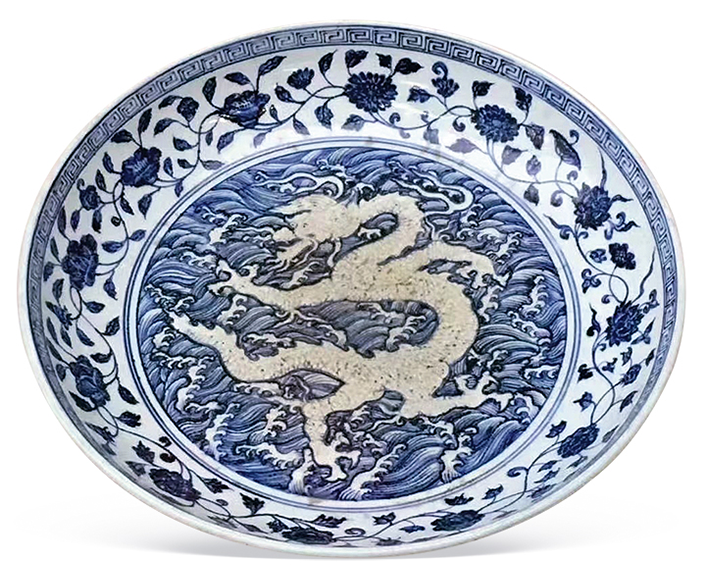明永乐青花留白锥刻海涛龙纹大盘(塞伦森龙盘)