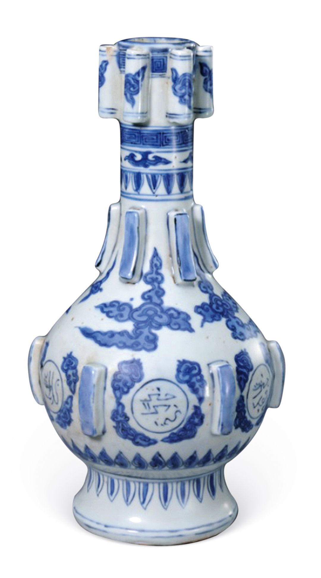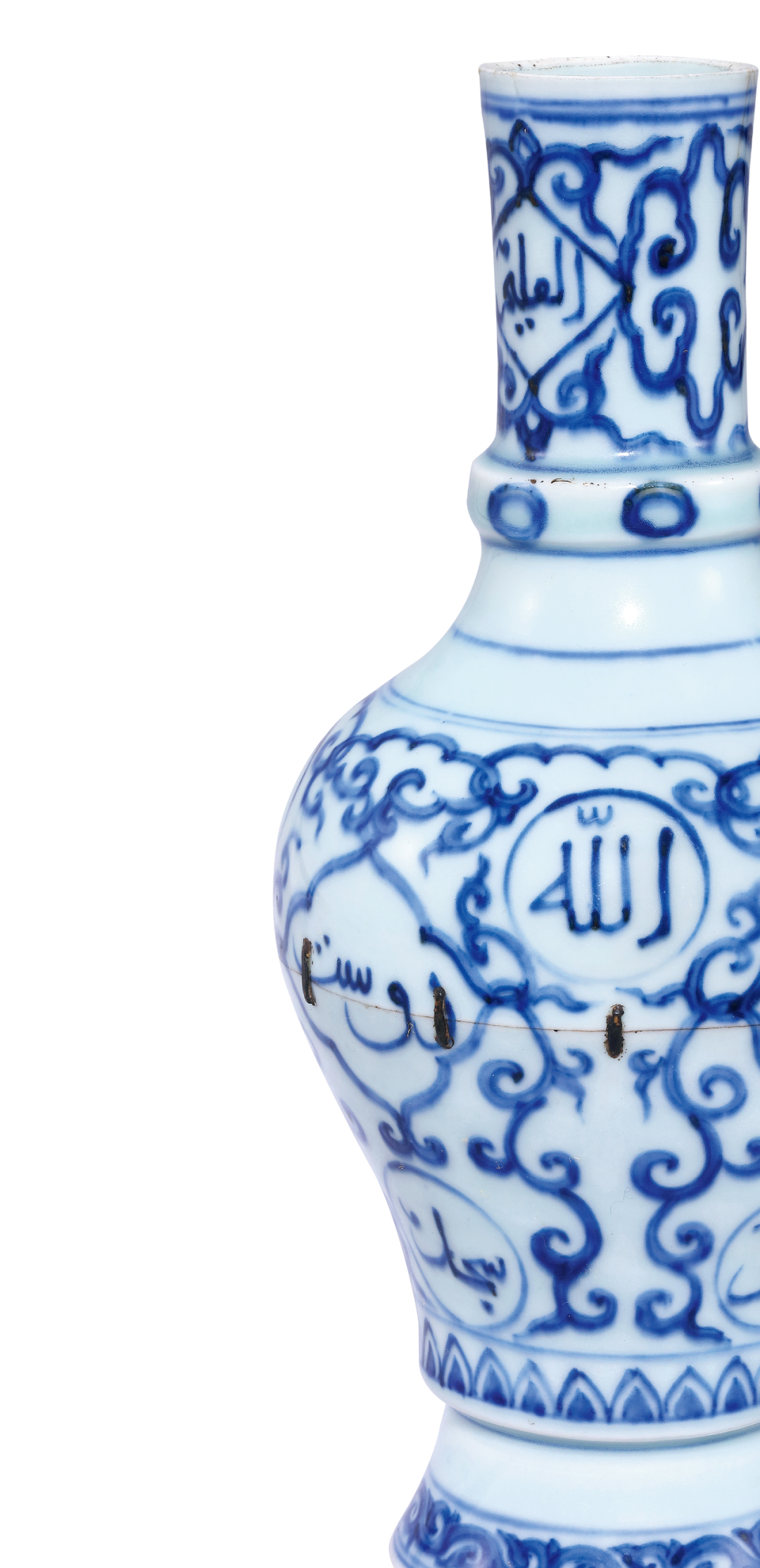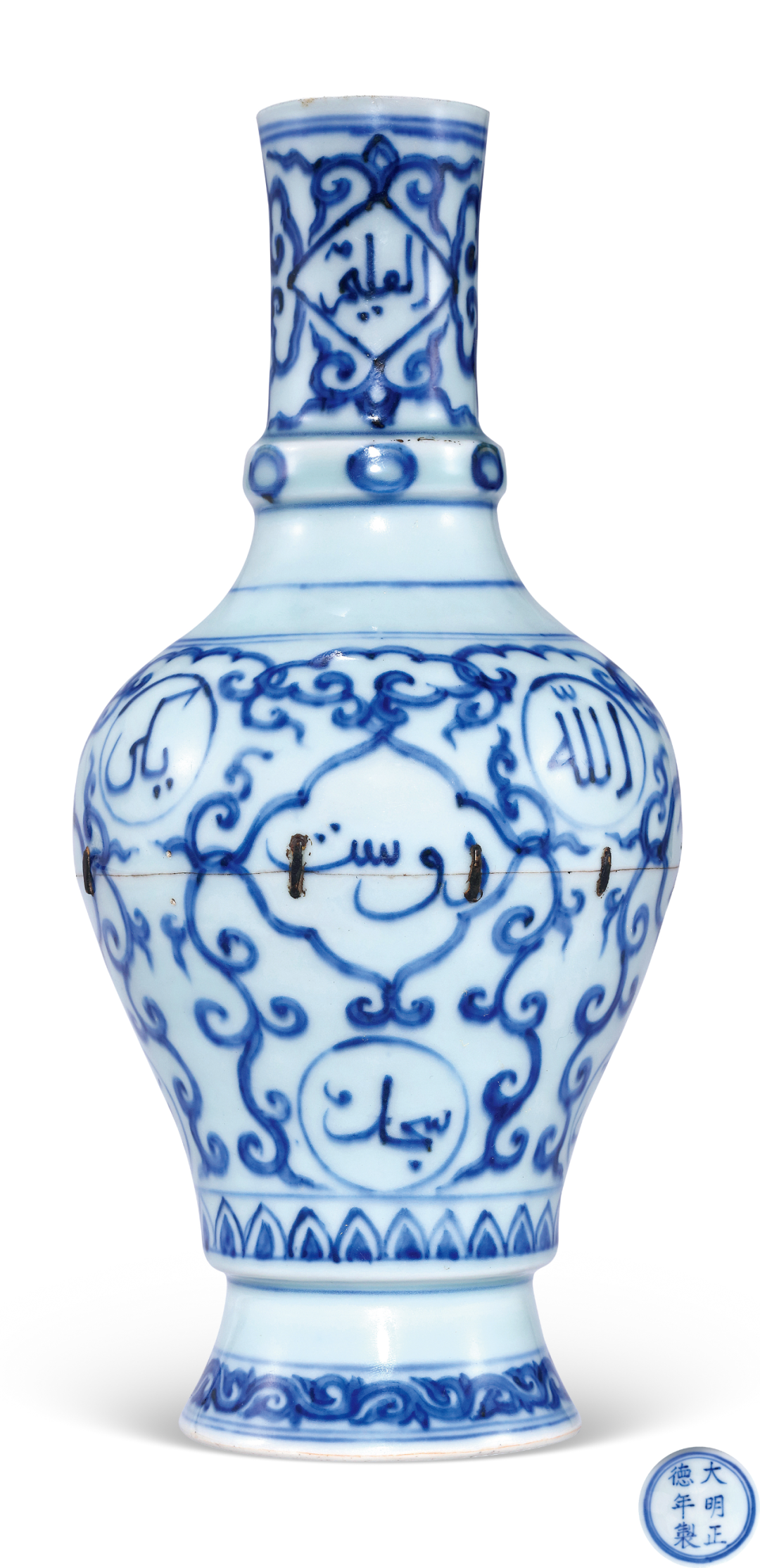 本品长颈,束颈饰鼓钉,丰肩渐收,撇足。口部以青花缠枝卷草纹为饰,棱形开光内写阿文;通体以大幅缠枝卷草纹或如意、圆形开光,内写阿拉伯文与口部呼应。独特的阿拉伯文装饰风格,正是见证中外文化交流最典型的例证之一。正德帝崇信伊斯兰教,因此他当朝的瓷器上大量用阿拉伯文和吉祥图案作为主体开光纹饰,开光内书阿拉伯文,意为“一切赞颂都归于真主”、“真主真伟大”、“赞美真主阿拉”等内容大多是吉祥语句。底以青花书“大明正德年制”六字双行楷书款。