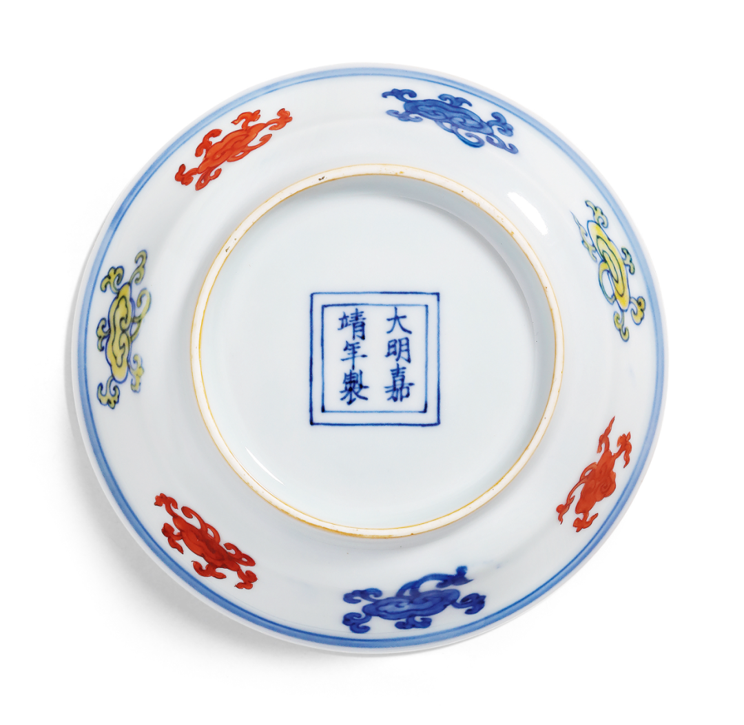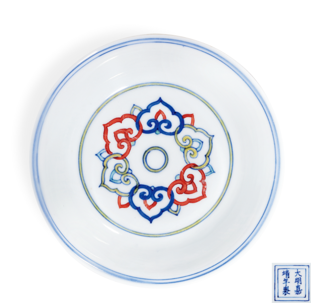 直口,直腹内敛,折腰,圈足,盘心绘斗彩如意头贯套纹,外壁口沿弦纹之下,绘以青花、矾红、绿彩绘七朵灵芝,纹饰简洁,清新爽目,丽质天成,颇得成化神韵。底施白釉,双圈内落青花“大明嘉靖年制”六字三行楷书款。